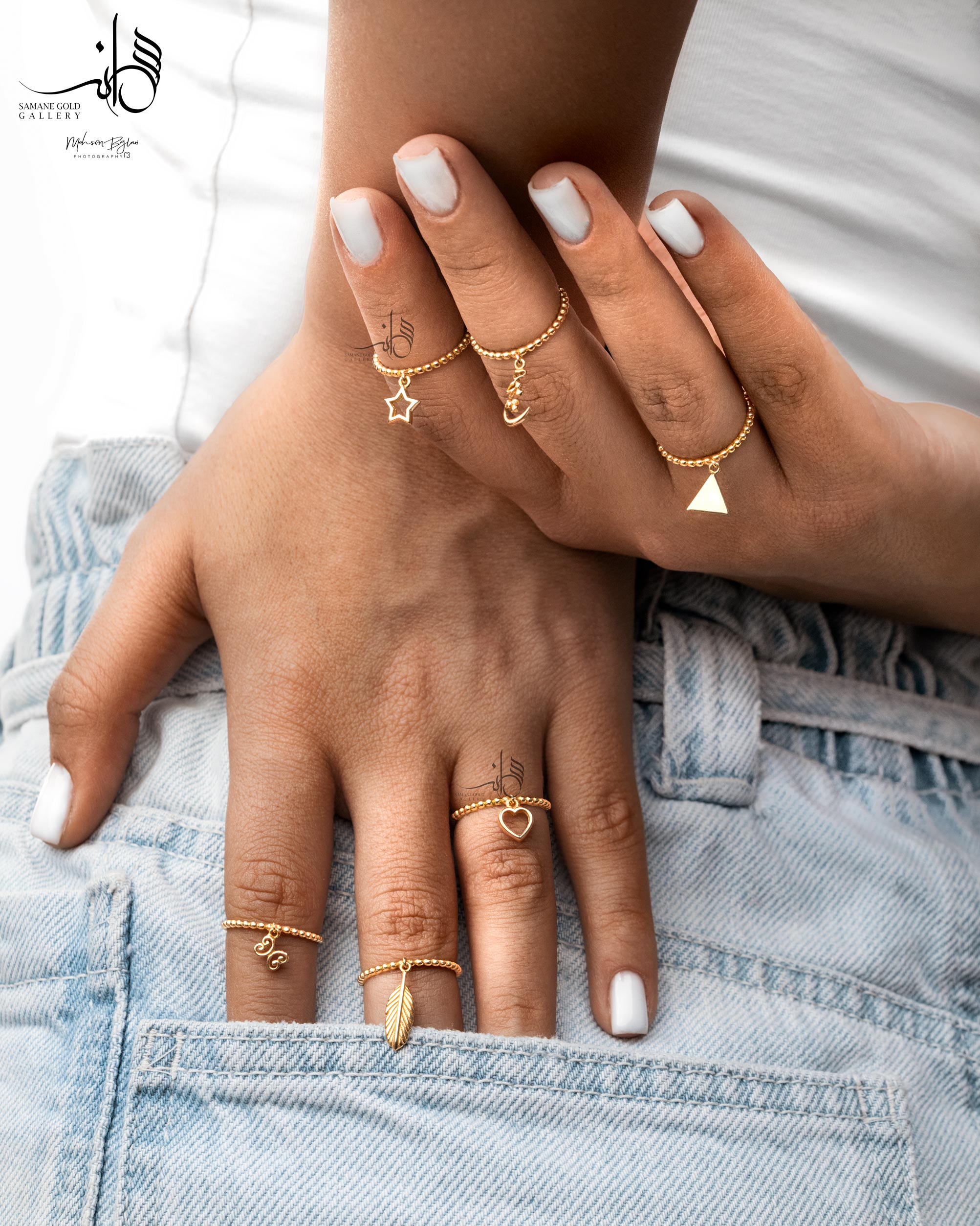 سه انگشتر ظریف در سه انگشت مختلف، استایلی مدرن و دخترانه ایجاد می‌کند.